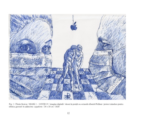 Fig. 1 / Florin Stoiciu / MASK 1 - COVID 19 / imagine digitală / desen în peniță cu cerneală albastră Pelikan / proiect simulare pentru tehnica gravurii în adâncime- aquaforte / 28 x 20 cm / 2020 12