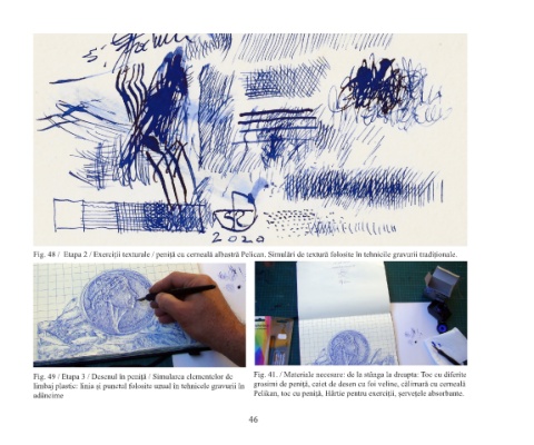 Fig. 48 / Etapa 2 / Exerciții texturale / peniță cu cerneală albastră Pelican. Simulări de textură folosite în tehnicile gravurii tradiționale.