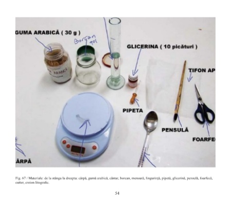 Fig. 67 / Materiale: de la stânga la dreapta: cârpă, gumă arabică, cântar, borcan, mensură, lingurință, pipetă, glicerină, pensulă, foarfecă, cutter, creion litografic. 54