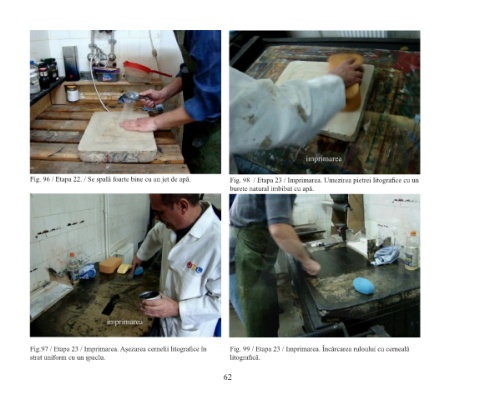 Fig. 96 / Etapa 22. / Se spală foarte bine cu un jet de apă. Fig. 98 / Etapa 23 / Imprimarea. Umezirea pietrei litografice cu un