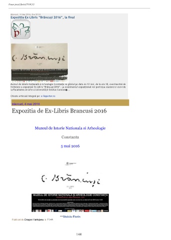 închidere a expoziĩiei Ex-Libris “BrâncuɁi 2016”. La evenimentul expoziɃional vor participa studenti si elevi de