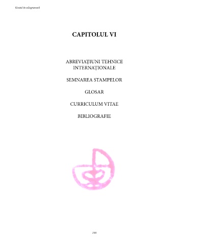 Gestul în xilogravură CAPITOLUL VI ABREVIAȚIUNI TEHNICE INTERNAȚIONALE SEMNAREA STAMPELOR GLOSAR CURRICULUM VITAE BIBLIOGRAFIE 188